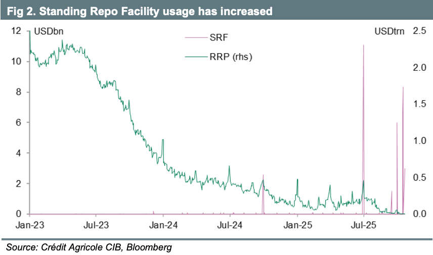 Certains estiment que la Fed pourrait Ă©galement envisager un abaissement de 5 points de base des taux administrĂ©s (IOR et SRF) pour mieux ancrer les marchĂ©s monĂ©taires dans la fourchette cible, ainsi quâun rachat de bons du TrĂ©sor Ă un rythme de 75 Ă 100 milliards de dollars par mois afin de reconstituer les rĂ©serves. Toutefois, ces mesures ne font pas encore partie du scĂ©nario central, la mise en Ćuvre dĂ©pendant du consensus au sein du FOMC.