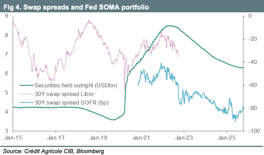 Historiquement, lorsque la taille du portefeuille SOMA avoisinait les 6 trillions de dollars (en 2020), les spreads Ă 30 ans Ă©taient autour de â40 points de base sur base Libor. En tenant compte de la transition LiborâSOFR, cela Ă©quivaudrait Ă environ â68 points de base aujourdâhui, proche des niveaux actuels.